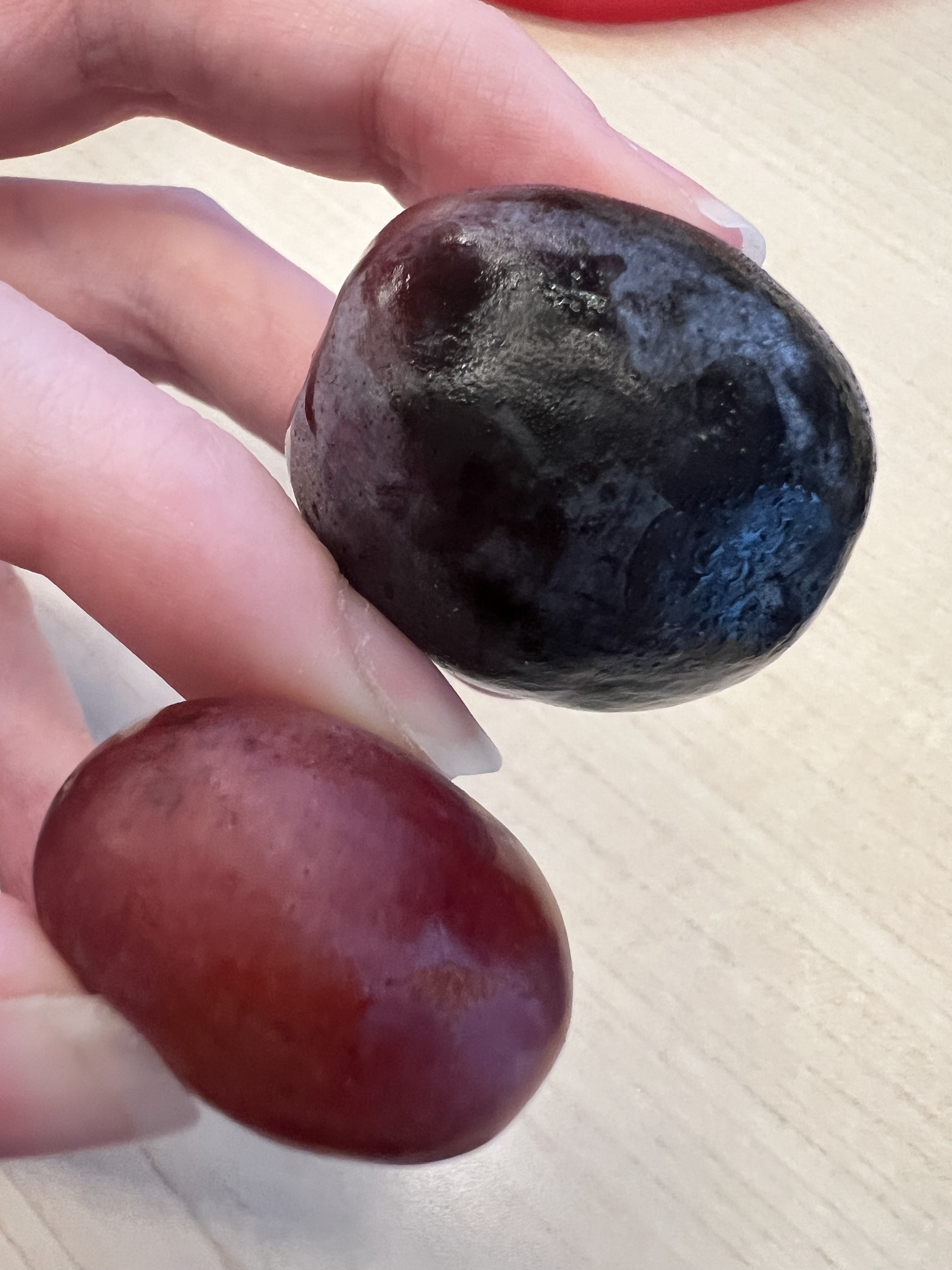 A giant black grape from Kroger compared to a red grape of more normal size. So delicious. You can practically eat them with a knife and fork.