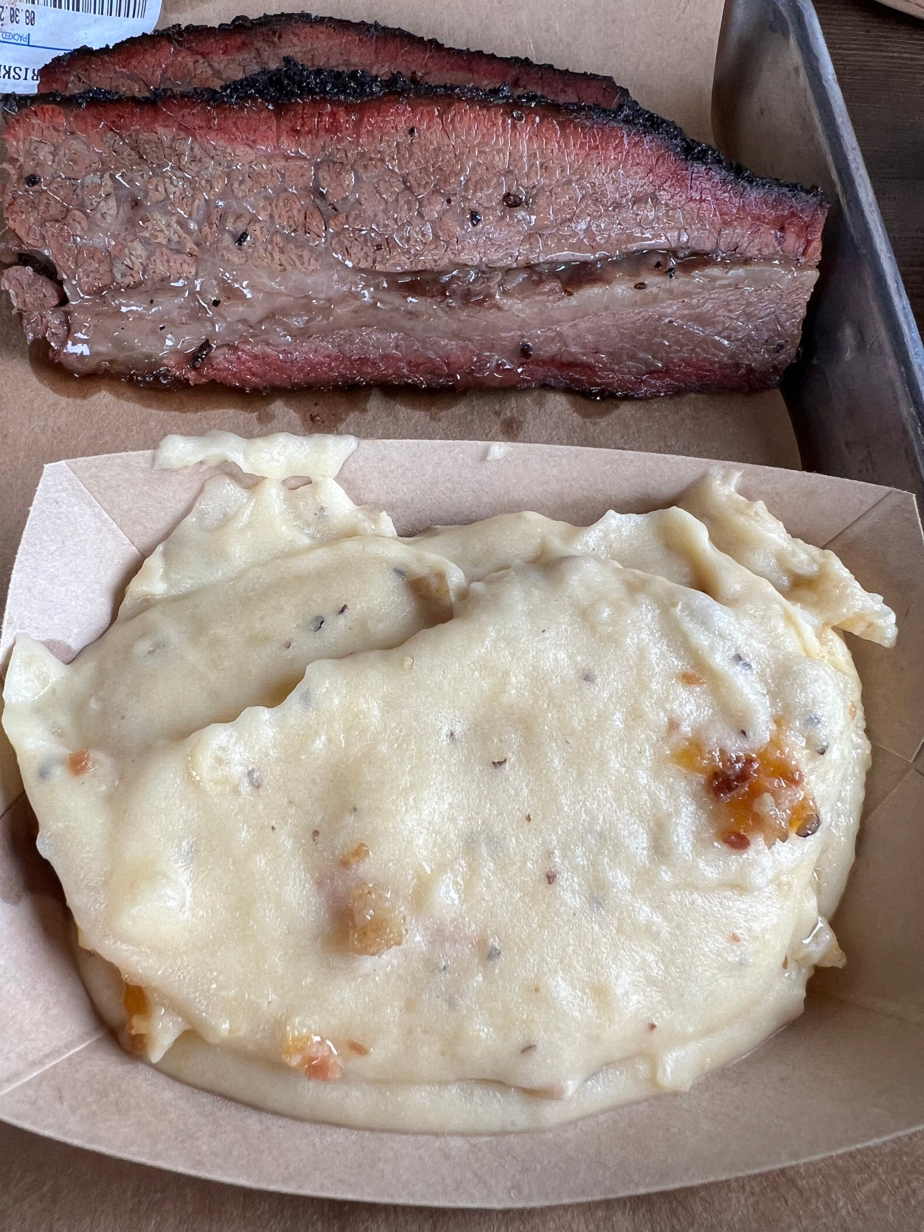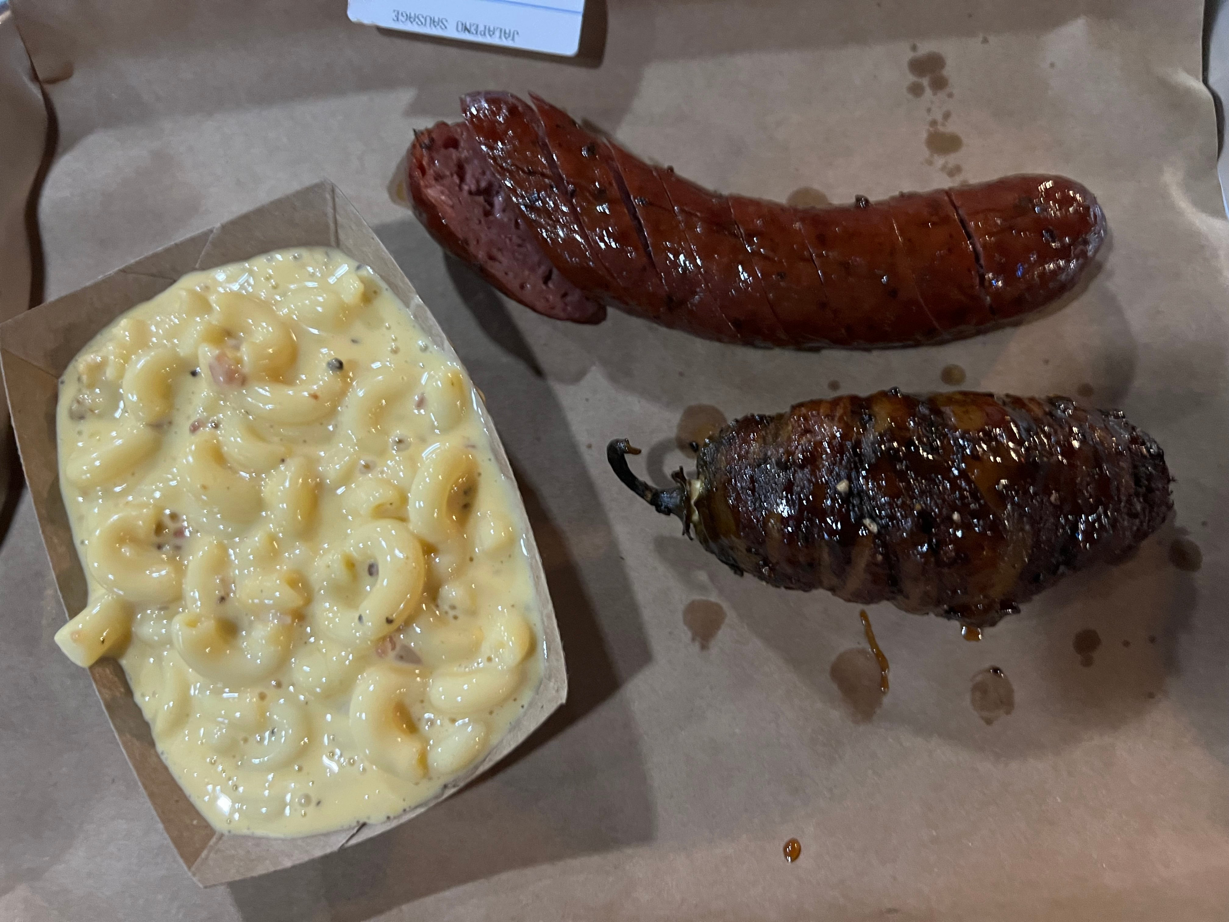 Jalapeño sausage, Texas Twinkie (a maple-syrup coated, bacon-wrapped jalapeño filled with brisket and cream cheese), mac & cheese