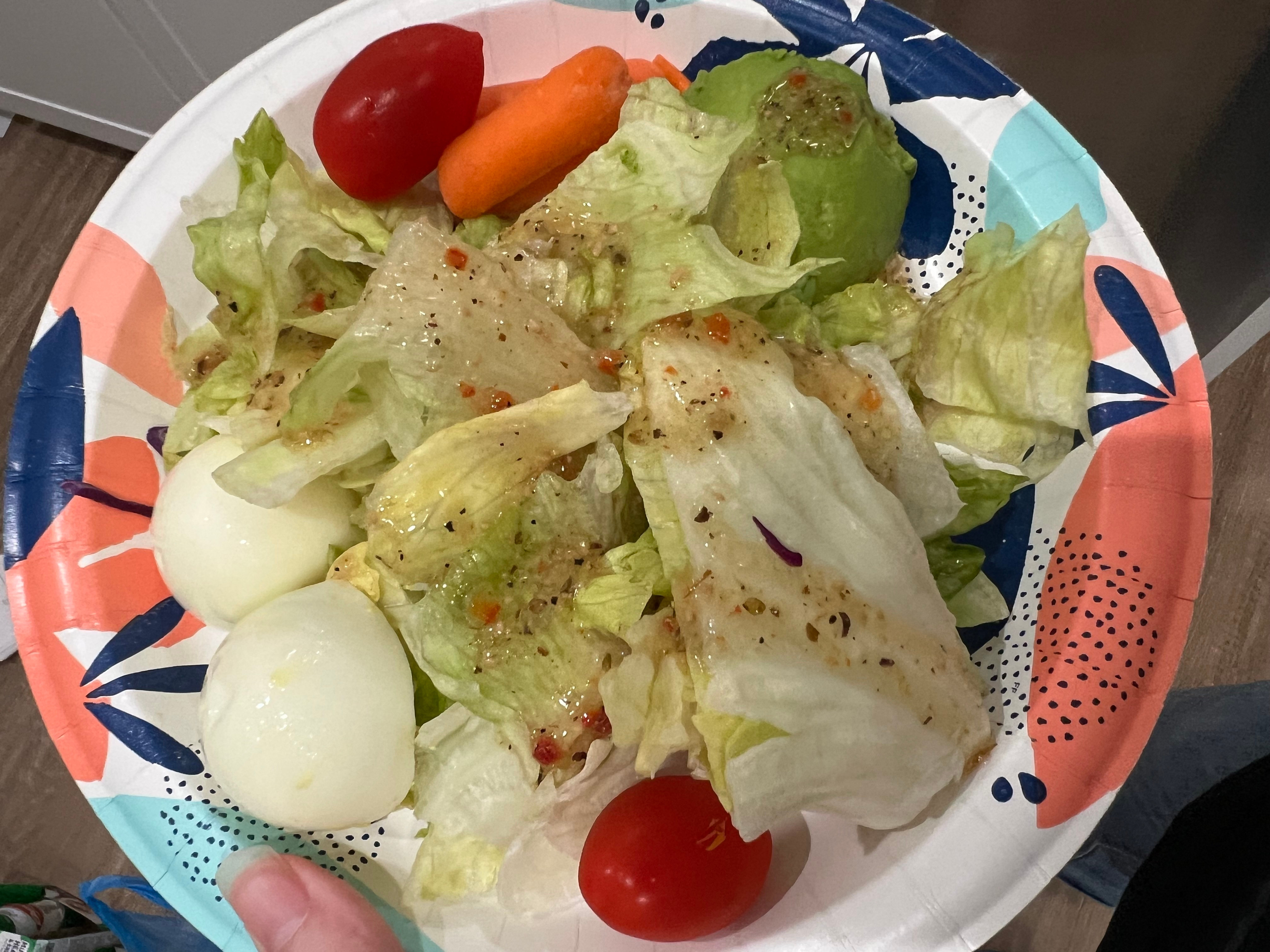 A low-cholesterol salad (lettuce, low-cholesterol dressing, half an avocado, hard-boiled egg with the yolk removed, veggies)