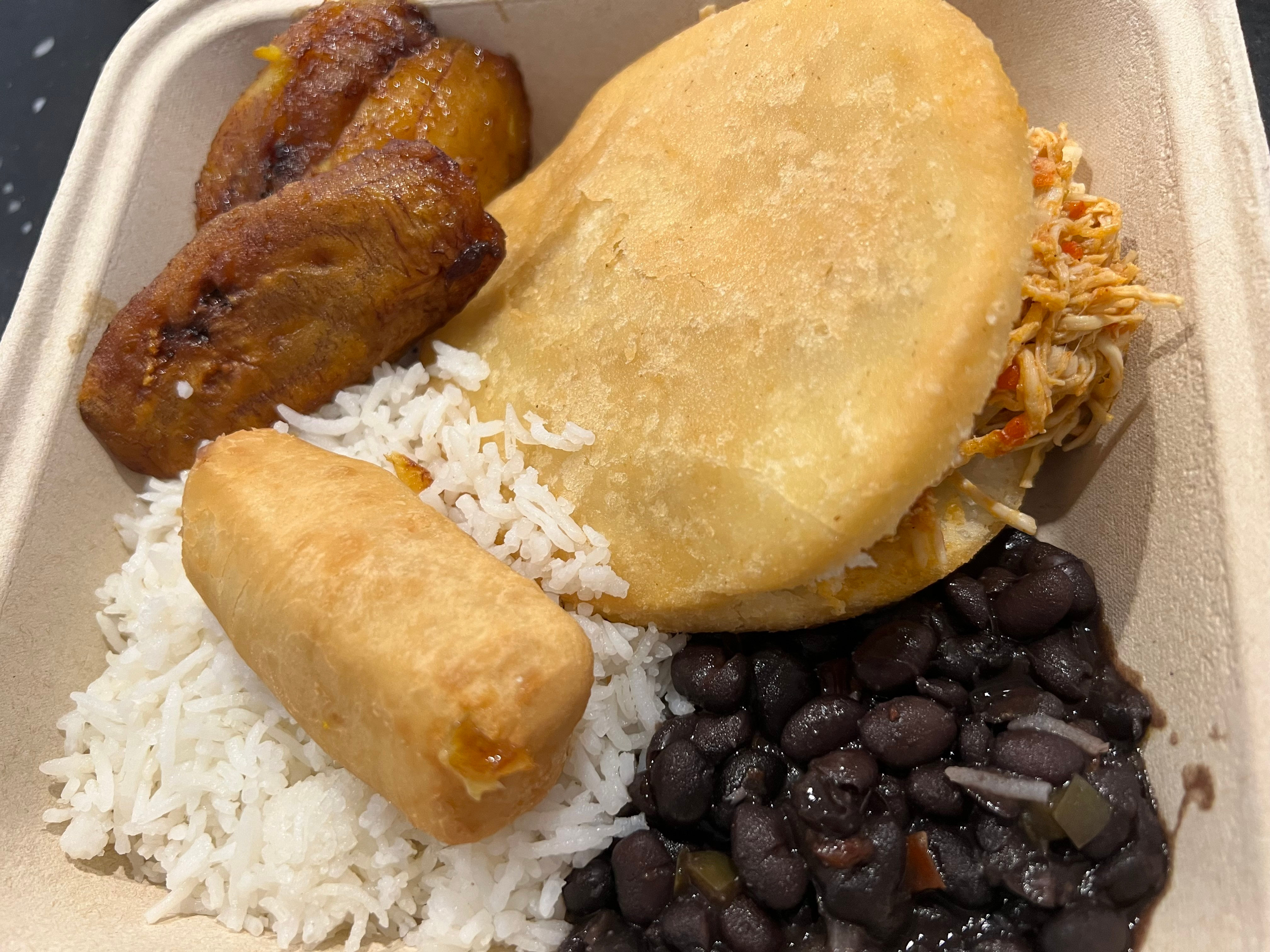 Arepa filled with chicken, rice, black beans, fried plantains, entrada (fried mozzarella stick)