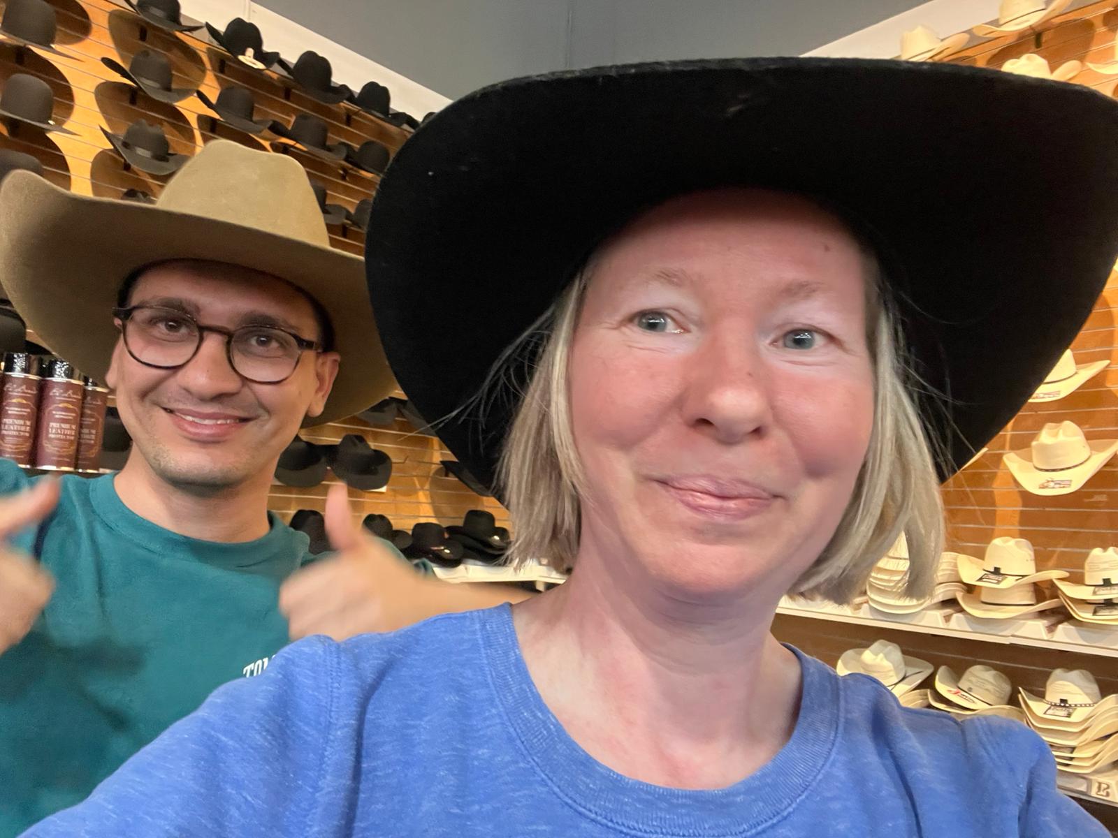 Me and my sweet Italian colleague from London trying on cowboy hats. He asked me for a selfie.
