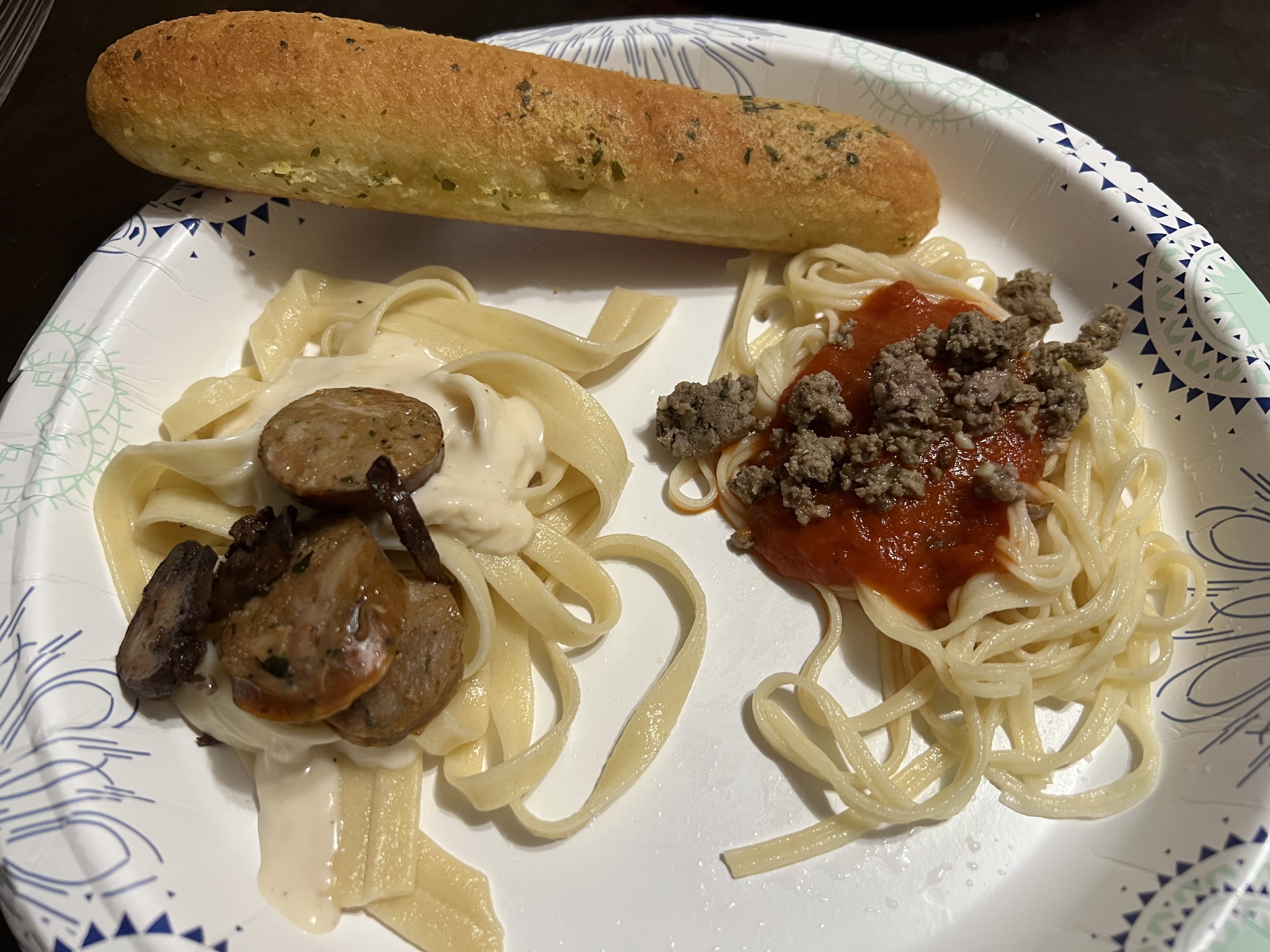 Round two… linguini, Alfredo sauce, mushrooms, spaghetti, marinara, hamburger, bread stick