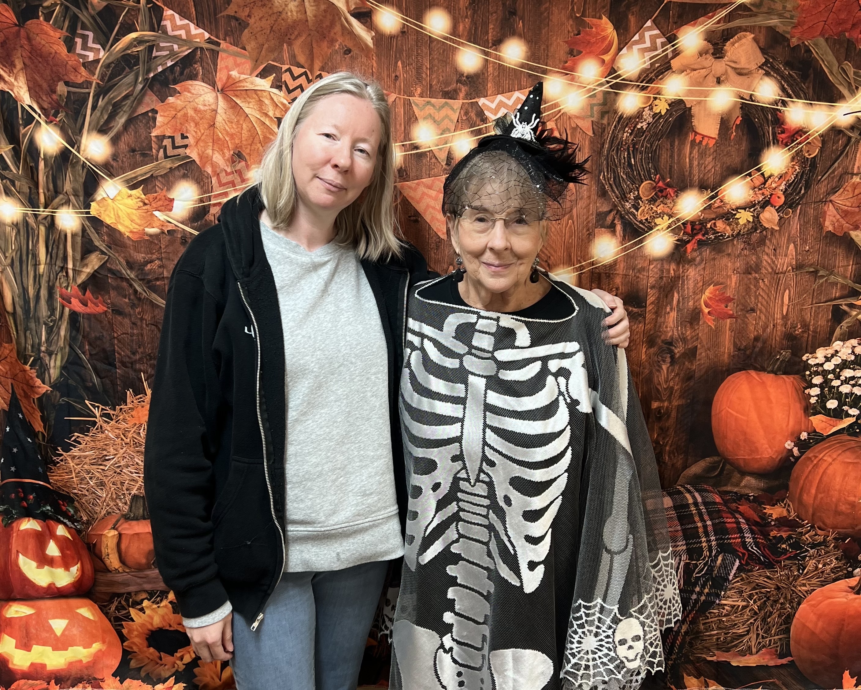 Mom and I before the Halloween party. She was wearing a skeleton costume that belonged to my Aunt Judy. I joked that I was dressed as a Prairie Sunset Home volunteer.