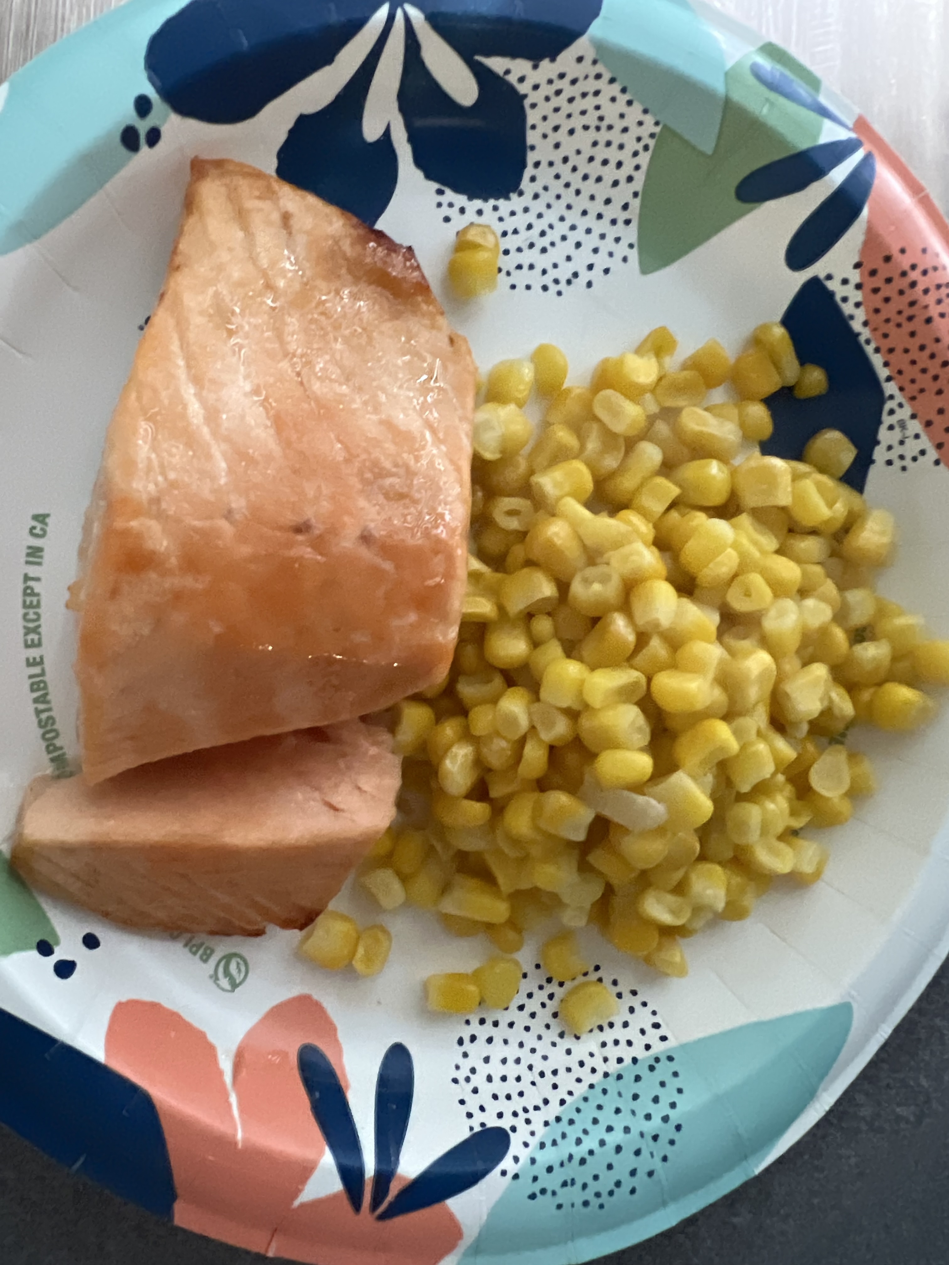 A baked salmon filet served with steamed sweet corn (I use Kroger 2 lb “Big Deal” individually wrapped Atlantic salmon portions that can be cooked from frozen. They are tastier and more convenient than the pink salmon version.)