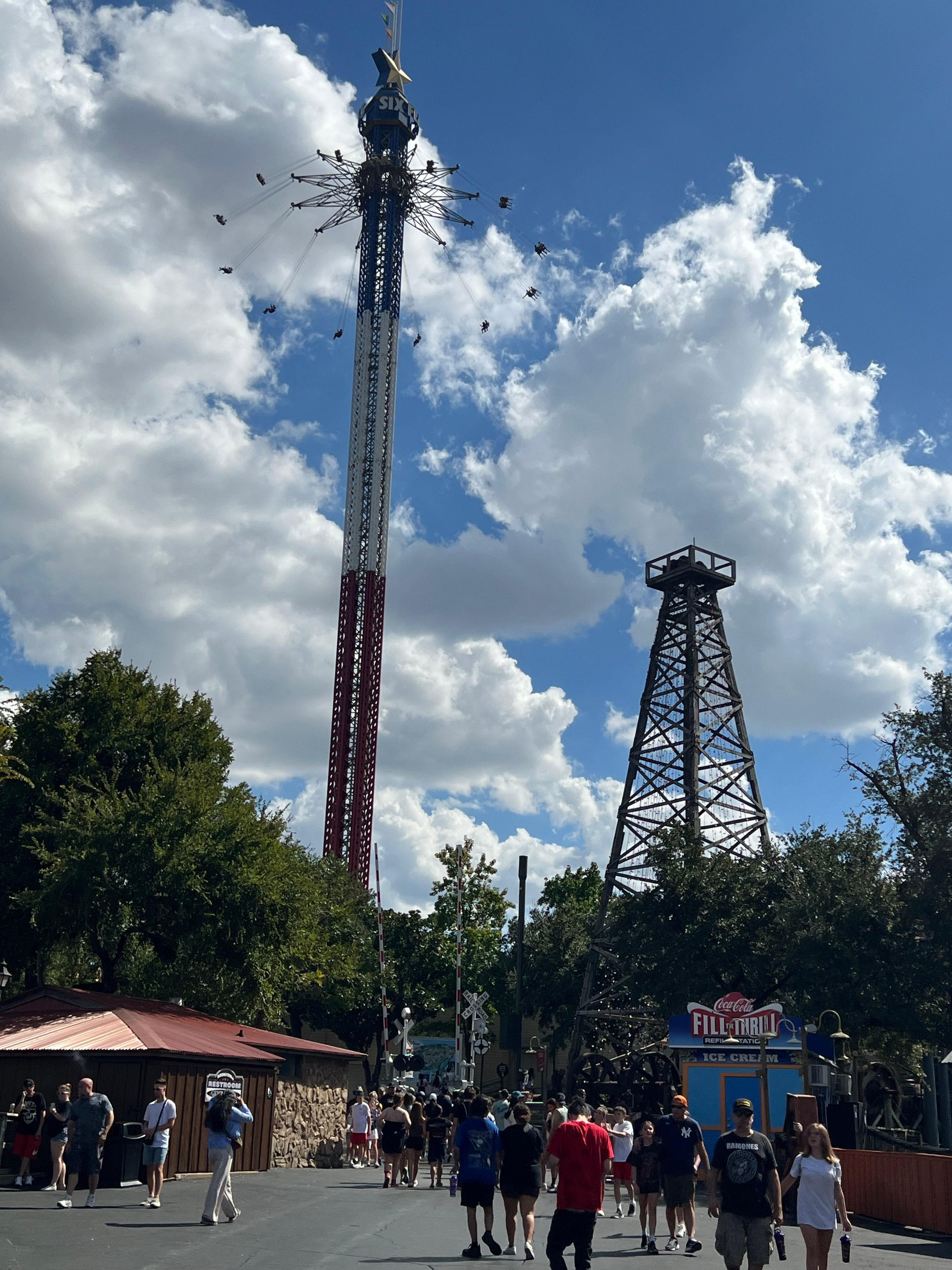 Texas SkyScreamer: the swing ride you see at a carnival, except it’s 400 feet in the air. Tallest ride at the park.