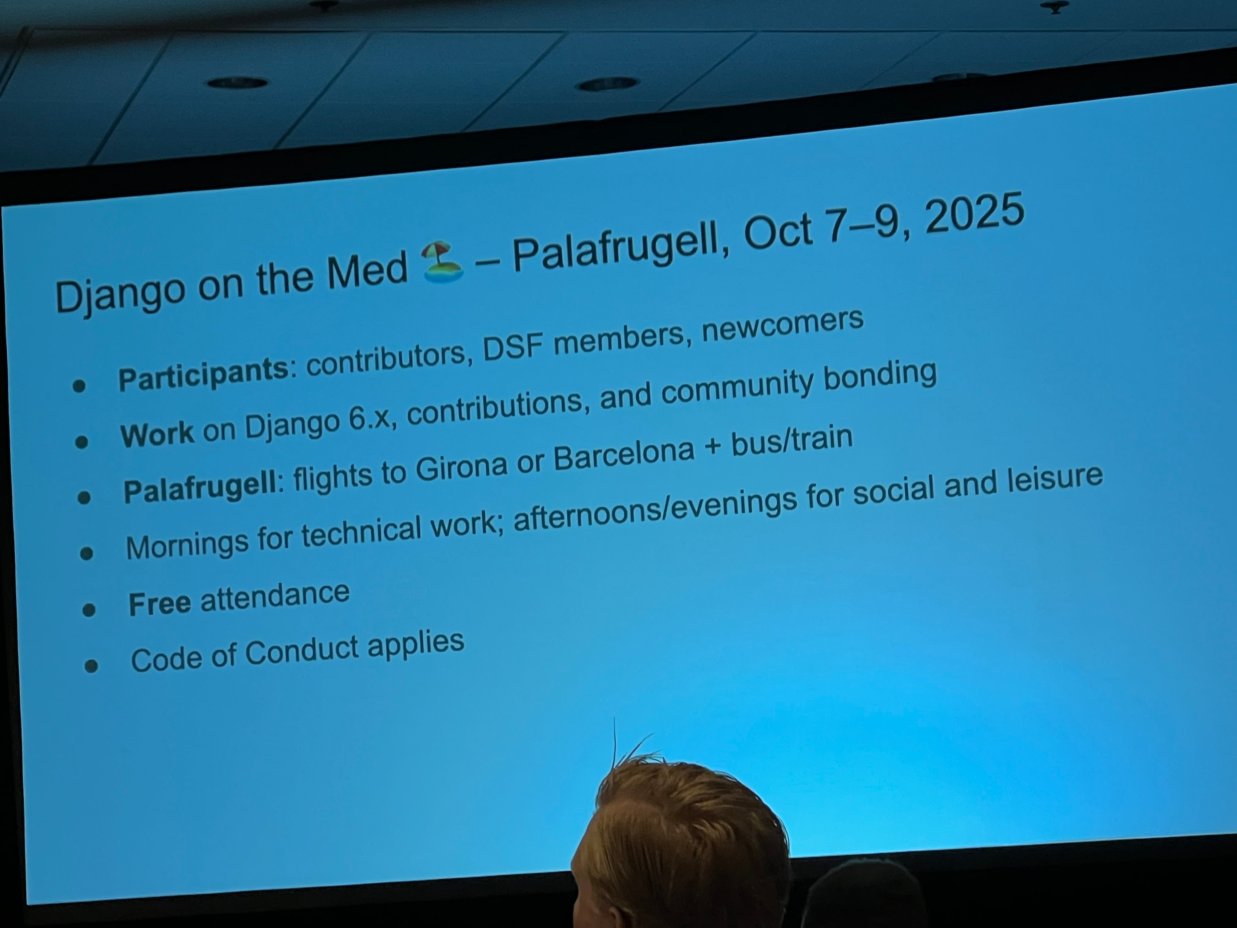 Based on an idea Paolo documented in his blog post My Django active developers Sprints proposal, Carlton Gibson and Paolo have begun to organize a twice a year Django development sprint called Django on the Med in Palafrugell, Spain and Pescara, Italy. The first one will taken place October 7-9, 2025, in Palafrugell Spain. If all goes well, they hope to organize them around the world. See the Django on the Med website for info about their serious goals and how to attend.